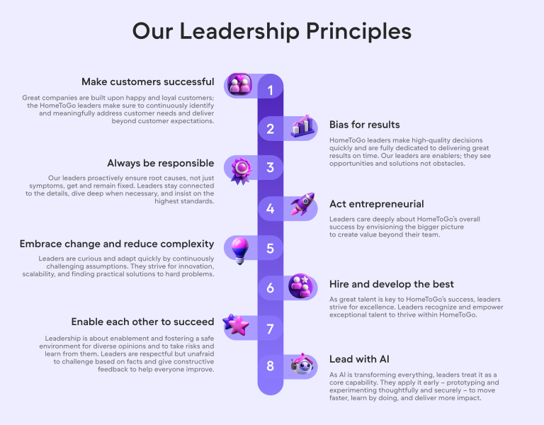 HomeToGo prioritizes the well-being of its team members and the wider community. This commitment to people and their growth is a fundamental aspect of our core values, also known as our leadership principles. |